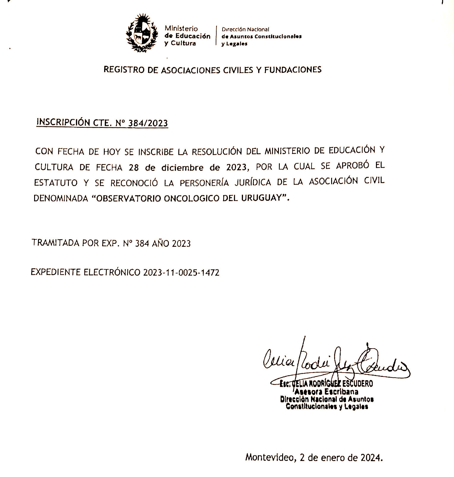 Con fecha 2 de enero de 2024, se inscribe en el Registro de Asociaciones Civiles y Fundaciones del Ministerio de Educación y Cultira el Observatorio Oncológico del Uruguay.